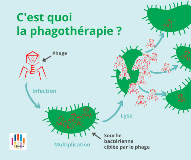 Un phage infecte une souche bactérienne et s’y multiplie jusqu’à provoquer la lyse (rupture de la bactérie). Une fois multipliés, les phages infectent d’autres bactéries, alors on parle de la phagothérapie.